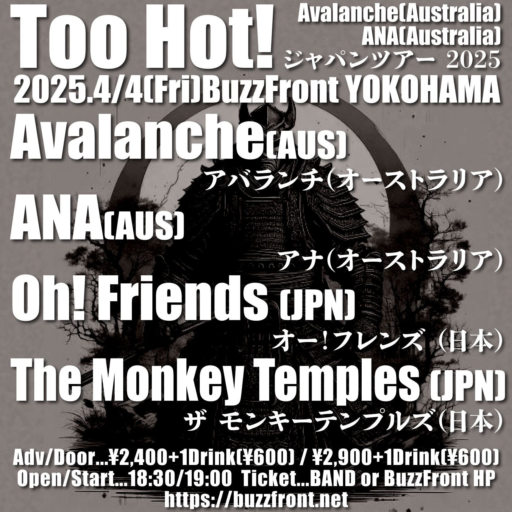 出演者 AVALANCHE(AUS) ANA(AUS) The Monkey Temples Oh! Friends OPEN 18:30 / START 19:00 前売 ¥2,400+1Drink(¥600) / 当日 ¥2,900+1Drink(¥600)