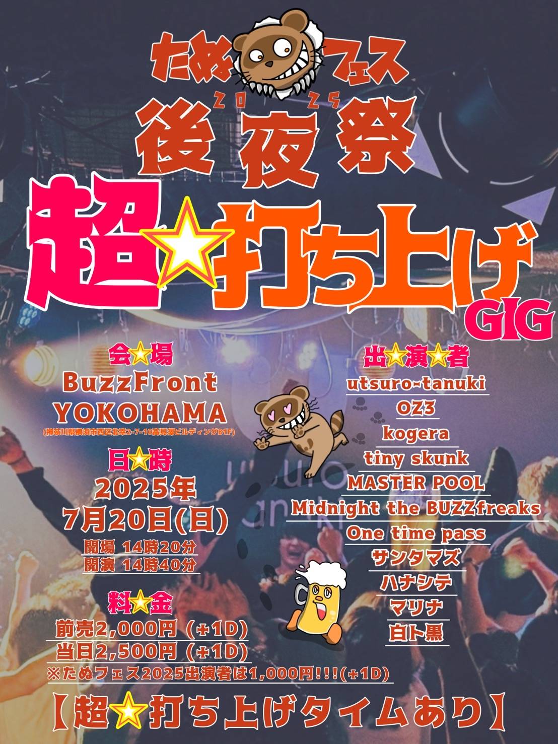 出演者 utsuro-tanuki OZ3 kogera tiny skunk MASTER POOL Midnight the BUZZfreaks One time pass サンタマズ ハナシテ マリナ 白ト黒 OPEN 14:20 / START 14:40 前売 ¥2,000+1Drink(¥600) / 当日 ¥2,500+1Drink(¥600)
