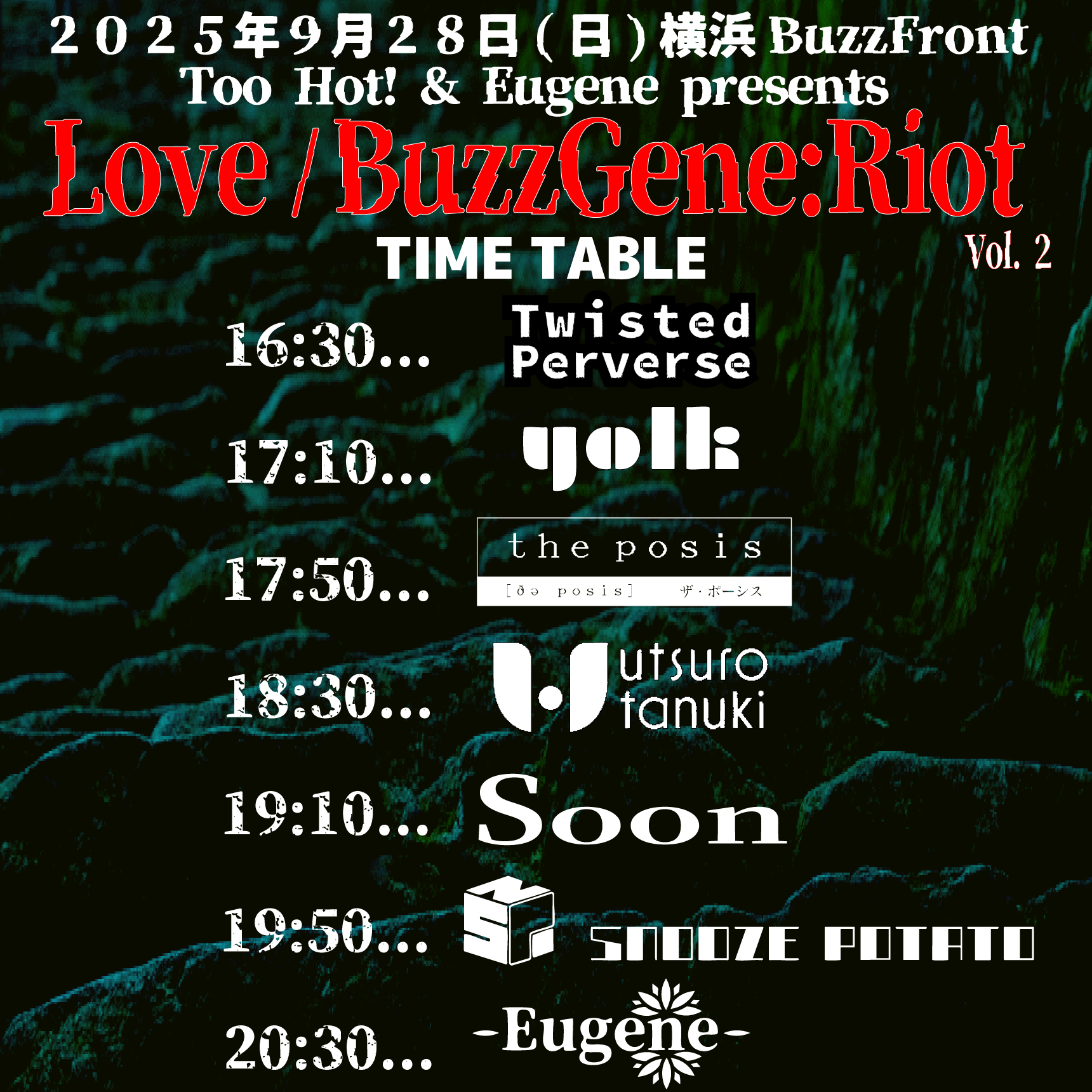 出演者 Eugene Snooze Potato Soon Twisted Perverse utsuro-tanuki the posis yolk OPEN 16:00 / START 16:30 前売 ¥2,400+1Drink(¥600) / 当日 ¥2,900+1Drink(¥600)