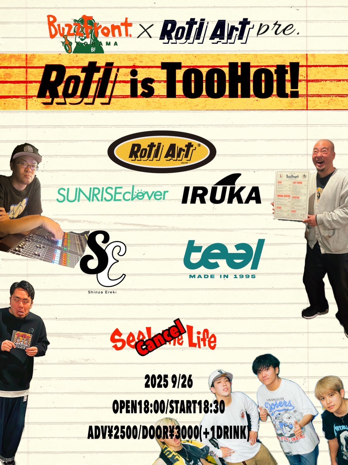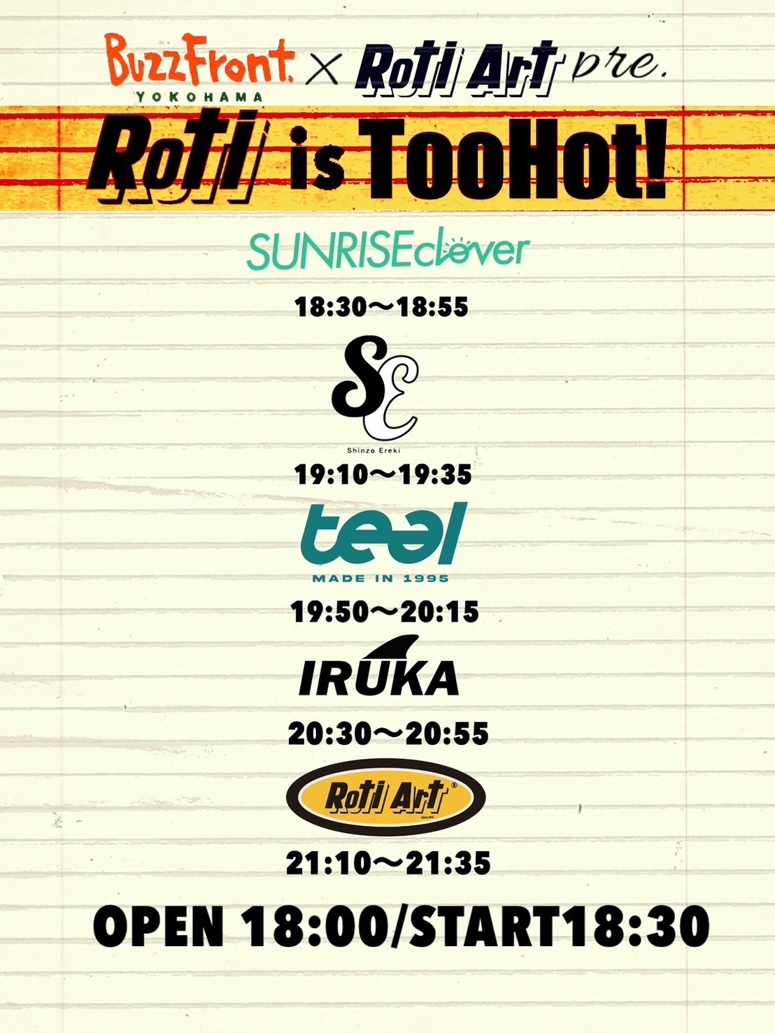 出演者 Roti Art SUNRISEclover 心臓エレキ teal IRUKA OPEN 18:00 / START 18:30 前売 ¥2,500+1Drink(¥600) / 当日 ¥3,000+1Drink(¥600) ロック / パンク / オルタナティブ
