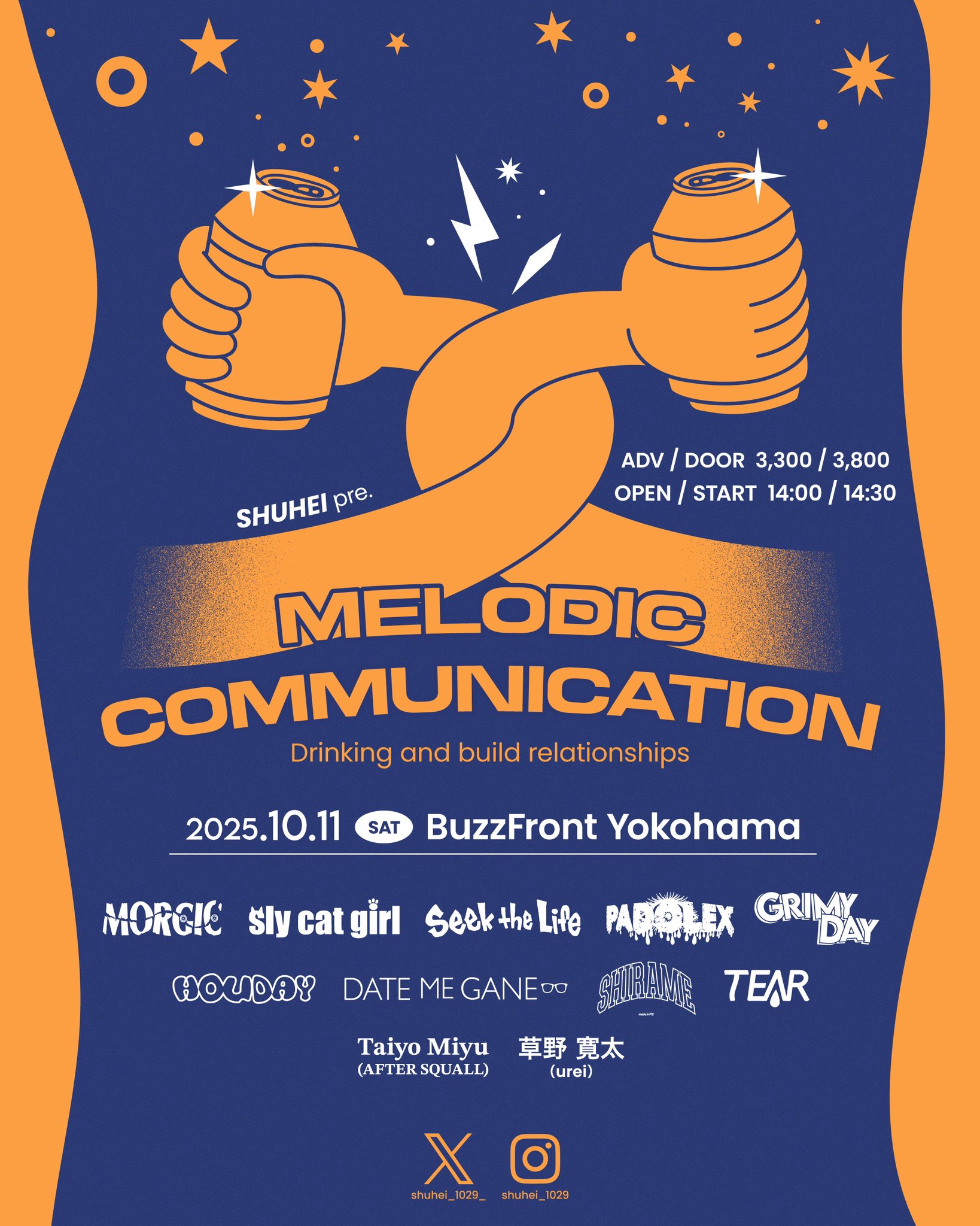出演者 MORGIC HOLIDAY sly cat girl DATE ME GANE Seek the Life SHIRAME PADOLEX Taiyo Miyu(AFTER SQUALL) 草野 寛太(urei) TEAR Grimy Day OPEN 14:00 / START 14:30 ADV ¥3,300+1D / DOOR ¥3,800+1D ポップス / ロック / パンク / オルタナティブ / アコースティック