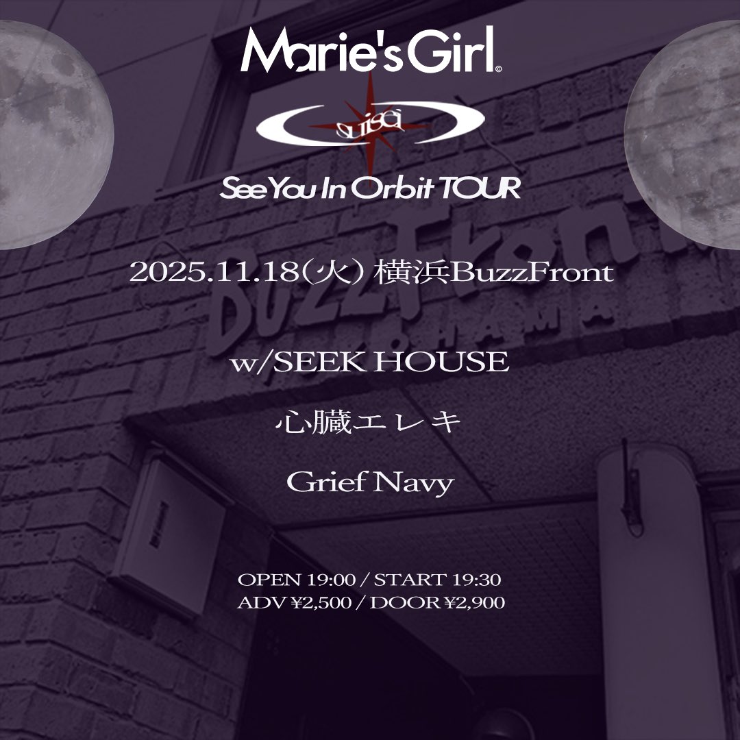 出演者 Marie's Girl SEEK HOUSE 心臓エレキ Grief Navy OPEN 19:00 / START 19:30 ADV ¥2,500+1D / DOOR ¥2,900+1D 1Drink ¥600 ロック / パンク / オルタナティブ