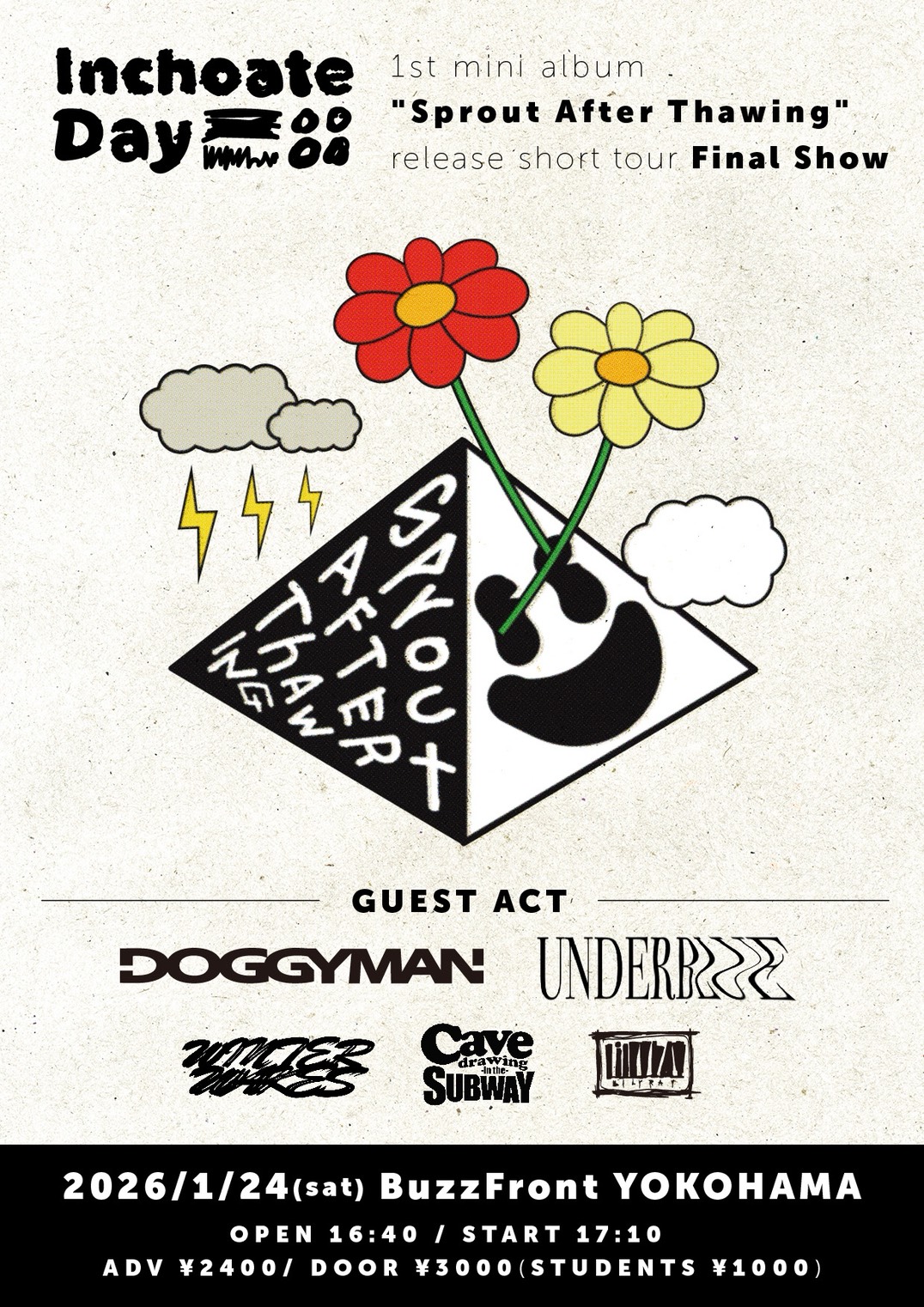 出演者 Inchoate Day Winter Wakes DOGGYMAN UNDERBLUE lilyray Cavedrawing in the Subway OPEN 16:40 / START 17:10 前売 ¥2,400+1Drink(¥600) / 当日 ¥3,000+1Drink(¥600) 学割 ¥1,000+1Drink(¥600) ロック / パンク / オルタナティブ
